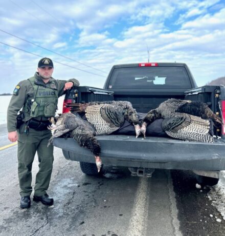 On February 27, ECO Seabury responded to a complaint from a resident who reported witnessing an individual shoot and kill several wild turkeys off a back porch in the Town of Orleans. Officer Seabury questioned the subject who admitted to firing four shots and killing three wild turkeys while they were feeding at a bird feeder in the dwelling’s backyard. The turkeys were hidden in the bed of the subject’s pickup truck.