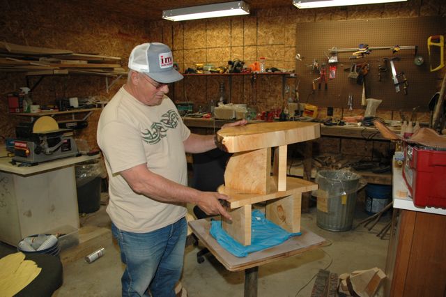 Retired U.S. Air Force Chaplain Father Richard Demers has been a priest in residence at St. Augustine’s Parish in Peru for about five years. A few months ago St. Augustine’s/St. Patrick’s Pastor Father Alan Shnob was having a few trees cut at St. Patrick’s Oratory. Father Demers happened to notice two slabs of wood from the fallen trees and asked if he could have them. Father Shnob couldn’t help but ask, “Richard, what are you going to do with those?” Today, Father Shnob knows only too well what his friend was going to with the wood slabs. The St. Augustine’s rectory is filled with Father Demers’ wood furniture (Click here to see more photos) – almost all of it fashioned from wood slabs.