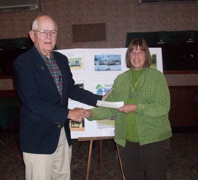 Peru Lions Club member Roy Perry presents a check for $1,000.00 to Harriet Burrell of Champlain Valley Habitat for Humanity. The money was raised during the 16th annual Peru Lions Club Stanley Hughes golf tournament held Sept 12th at the Barracks Golf Course.
