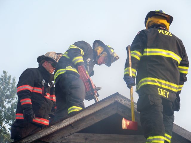 The 1100-degree temperatures measured on the house’s roofline made it a very warm summer evening for the personnel. The firefighters volunteer to do this while most of us are comfortable in our air-conditioned homes. A second practice burn will be held at 8:30 a.m. on Saturday, July 23, 2011 at a large home near the corner of the Mannix and Clark Roads. (Click here to see more Peru Gazette photos).