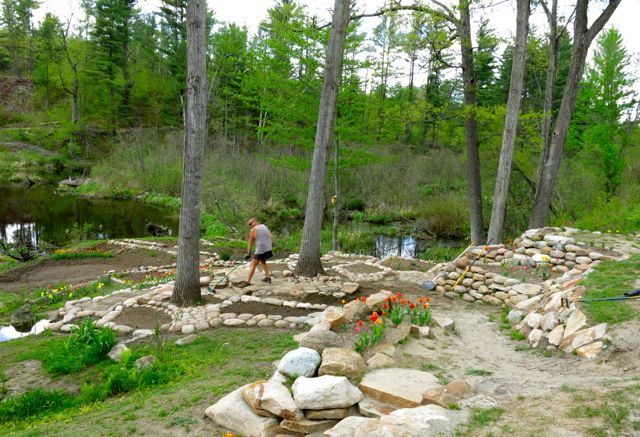 Ford has hauled the hundreds of rocks from Au Sable Forks. Visitors have donated birdhouses and other items. His friend Denise Leiper plants and takes care of the flowers. Tulips and daffodils are in full bloom, but many more varieties will be planted though the summer. Ford remarked, “New people stop by every day. They’re very respectful of the property. Sometimes I forget tools here and they’re always here when I return.”