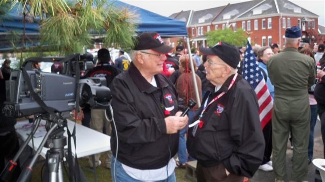 Upon their arrival many veterans, former Honor Flight escorts, scouts, citizens and media were in attendance. There was patriotic music playing as well as music from the WWII era (Don’t Sit under the Apple Tree). At the parade grounds the veterans and escorts registered, received nametags and a goodie bag with snacks and the itinerary.  Some were interviewed twice-once by the local cable TV and by the Peru Internet newspaper The Peru Gazette.