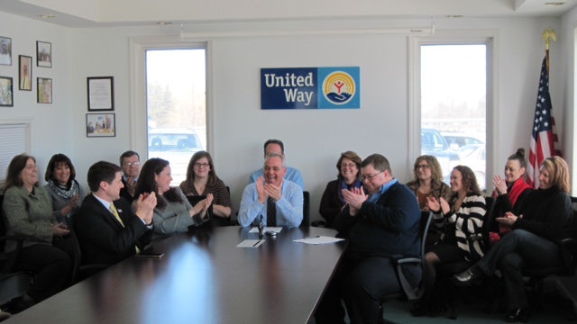 United Way Officials and the volunteer Campaign Team meet to announce to the media that the Campaign Team raised $725,115.00 for the 2017 Campaign to help with high priority health and human service needs throughout the Adirondack Region. Pictured here at the table from left to right is Assemblyman Billy Jones, Past Campaign Chair and Board Member; Amy Kretser, Campaign Chair; John C. Bernardi, Executive Director/CEO; Bill Ferguson, SEFA Chair and pictured in the back are members of the United Way Campaign Team and staff.