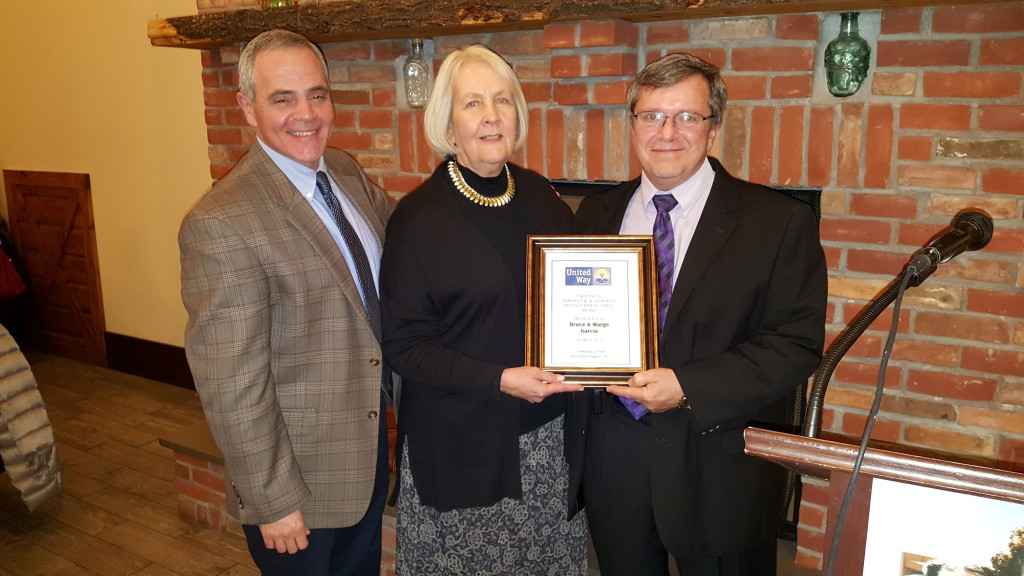At the United Way of the Adirondack Region, Inc. Annual Meeting and Recognition Dinner on Saturday, March 4th, 2017, Bruce & Marge Garcia, were the recipients of the 33rd Annual Dorothy & Alan Booth Distinguished Citizen Award. John Bernardi, CEO of United Way of the Adirondack Region, Inc. said, “Bruce and Marge are outstanding people. Their kind and generous spirit is an inspiration to many and they give selflessly to the betterment of the Adirondack Region. They are both fine examples of what it means to be a distinguished citizen and we can all strive to be more like them.” Pictured is Bernardi with Marge and Bruce Garcia.