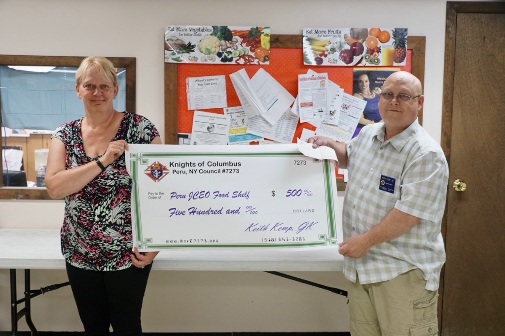 Peru – St. Augustine’s Knights of Columbus Council 7273 recently assisted the Peru JCEO Food Shelf by conducting a “40 Cans For Lent” program at St. Augustine’s Church. The knights asked parishioners to contribute food during the 46 days of Lent. They generously responded with 1,057 pounds of nutritious food. The council followed up with a $500 donation. The combined donations will earn $200 in matching funds from the Knights of Columbus Supreme Council.