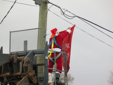 Thanks to Marque Moffett for a photo and this report: “Seen on Pleasant St. this morning: Luke Fessette hangs banners to welcome the holiday season. On the ground is Chris Malin. Luke didn’t expect to hang the banners until Monday. He just ordered the Santa suit and, when it arrived today, he ran home on his lunch break so he could put it right into action this afternoon.”