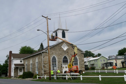 Two of Peru’s houses of worship have much-needed repair work in progress today. Both projects are part of past capital fund drives. Repairing the church steeple is the Peru Community Church’s first project. St. Augustine’s Church is having its church parking area paved today. Last year the parish center parking lot was paved.