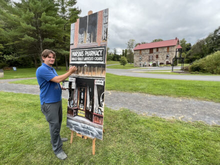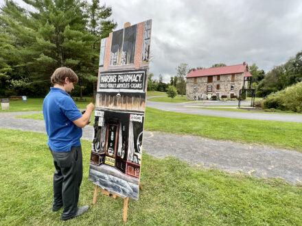 Heyworth Mason Park, Peru, NY- It was about two years year ago when town councilman Melvin Irwin asked Peru Middle School art teacher Greg Badger if he’d be interested in utilizing his art talents at Heyworth/Mason Park—the town needed to replace the rotting plywood covering the window of the park’s 1836-era stone building. Irwin had an idea: why not replace the plywood with paintings depicting Peru’s rich history, especially its historic buildings? Irwin recalls, “I was raised listening to stories of Peru in its glory years, especially Masons Mill and its employees.” Badger responded “yes” to Irwin’s question, so over the past several months, using black and white photographs as a source, Badger has completed twenty-seven images that are the talk of the town. He commented, “Mel was the spark that lit the flame.”