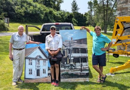 The three-story stone Mason building presented some challenges when installing large paintings. Mel Irwin employed his farming ingenuity for the first and second floors, using only a ladder, pulleys, and a bracing system to guide the panels in place. Sunday, Irwin and Greg Badger used a lift to reach and install the paintings on the third floor. Badger commented, “It was a fun spectacle and appropriate for completing the project.”