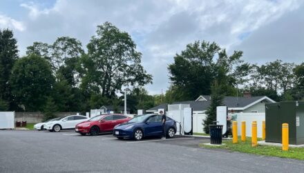 At 2:40 p.m., four Tesla vehicles were being charged. One man, accompanied by two passengers, was traveling to Massachusetts after enjoying a weekend in Montreal. A family of four was traveling to Connecticut after visiting friends in Plattsburgh.
