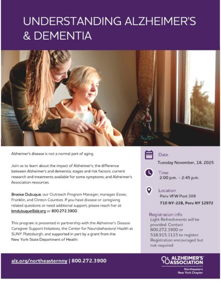 The Alzheimer’s Association is partnering with the Peru VFW to offer free dementia centered education at the Peru VFW Memorial Post 309 on Nov. 18 @ 2:00pm. The Association will be offering light refreshments and would love to see a good turnout. A document that outlines the correlation between veterans and dementia is attached. More information can be found at The North Country Alzheimer’s Association Facebook Group. Veterans and Alzheimer’s Disease