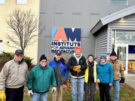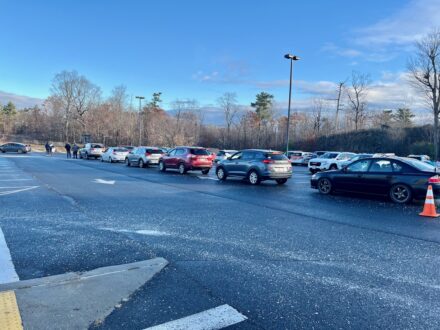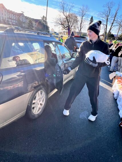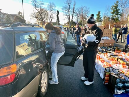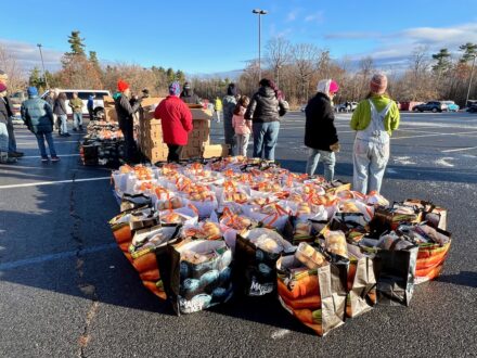 Saturday, Nov. 2025 – Plattsburgh – The sun shined and atmosphere was casual and joyous this morning at 8:40 a.m. at the Regional Food Bank Thanksgiving Meal Distribution at the Institute for Advanced Manufacturing at the Clinton Community College’s former Campus. More volunteers than expected arrived at 7 a.m.. By 8:15 a.m., they had 350 Thanksgiving meals bagged outside the Institute for distribution, on a first-come, first-served basis. Distribution started at 9:15 a.m., when the vehicle line-up wasn’t long, but traffic flow was continuous. Distribution was to continue until all the meal supply was exhausted.