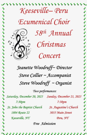 Posted: December 3rd, 2025 under Adirondack Region News, Arts and Entertainment, Community Events, Peru News, Religious News.