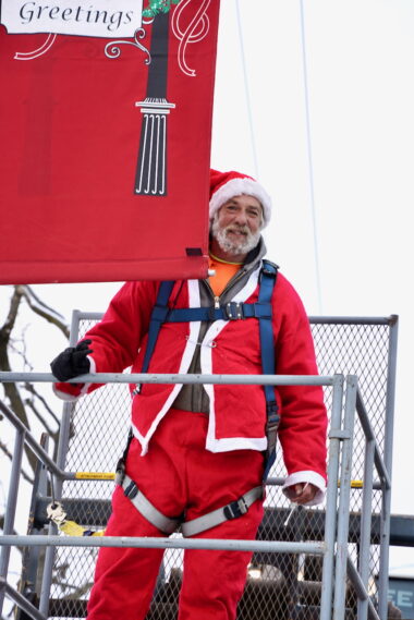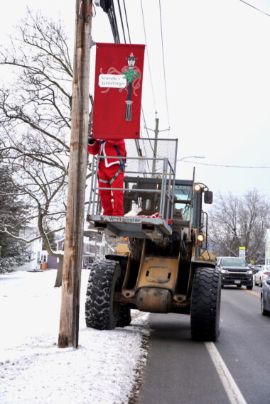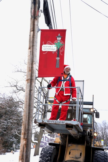 Wednesday, Dec. 3, 2025 – Luke Fessette is up in the heights today installing Peru’s Holliday Banners. Great job, Luke!