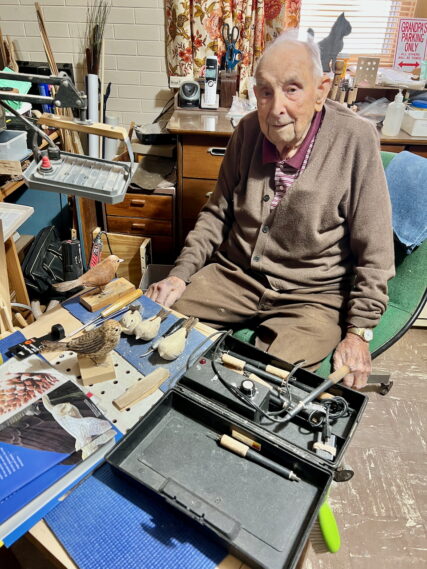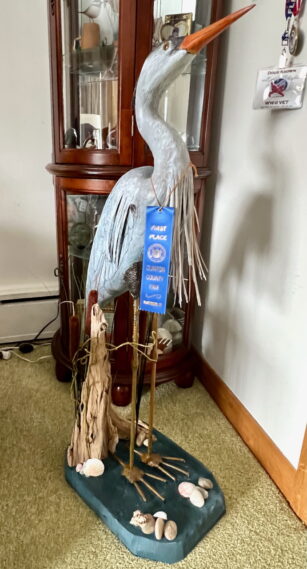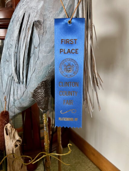 Bird carving is still Doug’s favorite pastime. A beautifully carved heron proudly displayed in his living room features a First Place ribbon hanging from its neck, a testament to his craftsmanship that earned him the award at the Clinton County Fair last summer. Before I left, he eagerly showed me the birds he was currently working on in his workshop. He pointed to one in particular, mentioning that he was redoing it because he wasn’t satisfied with how he had painted it.