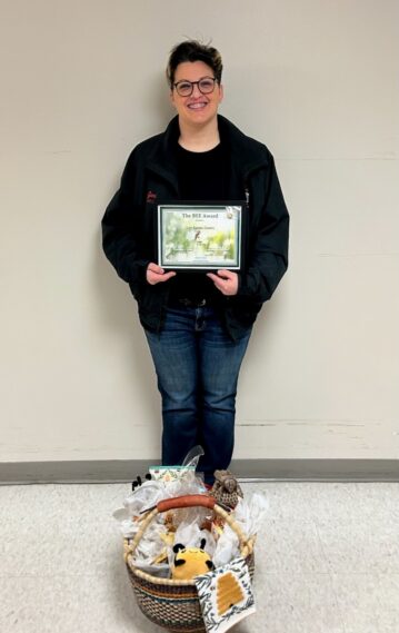 Wisher nominated Kaplan-Downs for the hospital’s BEE (Beyond Extraordinary Everyday) Award, and she was presented with the honor during a surprise ceremony with her colleagues. During the award presentation, she was presented with a certificate commending her for her extraordinary work. Kaplan-Downs, like all honorees, also received a BEE Award pin, a beautiful and meaningful sculpture and a basket filled with bee-themed gifts.