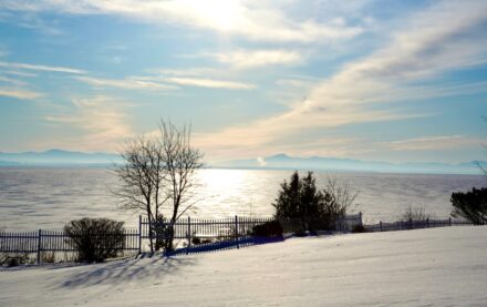 Peru, NY, February 19, 2026. Morning view of Lake Champlain and the Green Mountains,